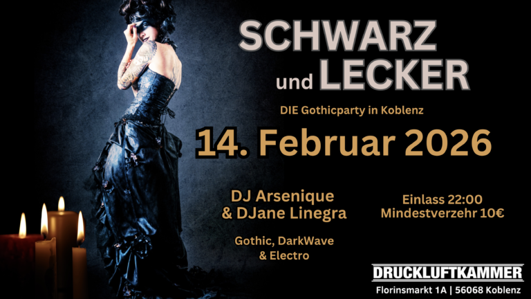 Seit über 15 Jahren ist die „Schwarz und lecker“ ein fester Bestandteil des Druckluftkammer-Programms. Tauche ein in die düstere und faszinierende Welt der Gothic-Kultur, während wir sowohl die zeitlosen Club-Klassiker als auch neue Musik feiern, die den Geist der schwarzen Szene einfängt.